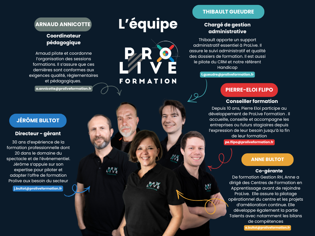 ProLive fait appel à des formateurs expérimentés, qualifiés, passionnés et compétents, toujours à l’écoute des stagiaires et proposant des programmes pertinents, complets et sans cesse actualisés.